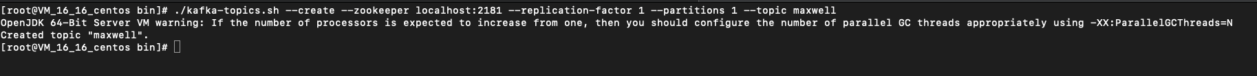 bin/kafka-topics.sh --create --zookeeper localhost:2181 --replication-factor 1 --partitions 1 --topic maxwell