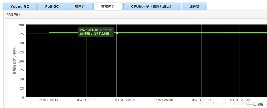 很遗憾,重启后运行一段时间发现,系统CPU负载依然会升高。后来通过公司的统一监控平台证明了我的CodeCache并没有使用满,由于CodeCache是属于堆外内存,然而我的系统堆外缓存使用一共还不到200M,所以也从一方面证明了思路一的方向是错误的。非堆内存使用大小截图如下: